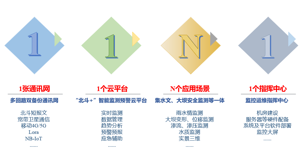 利用北斗高精度定位、物联网、宽带卫星通信、AI智能、实景三维等信息技术,建设“11N1”水利综合监测体系。