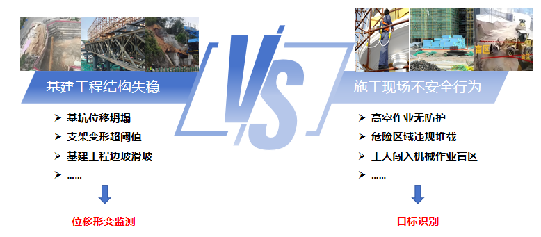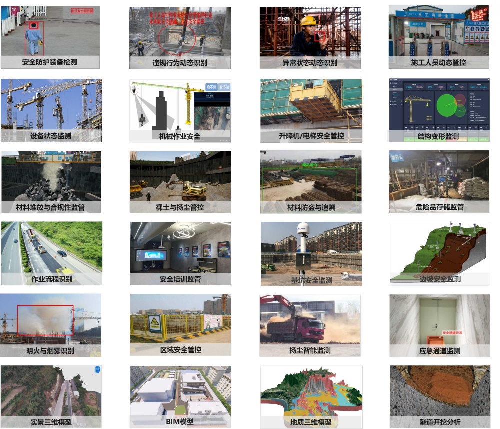 | 基建工程施工场景复杂、地质条件多变,结构沉降变形风险突出。 人员违规操作、设备物料管理不规范问题频发。 传统人工巡检效率低、覆盖不全、响应滞后,现有信息化系统难以实现全时段、全方位智能化安全管控。 安全隐患排查与处置效率亟待提升。 | ![]() |