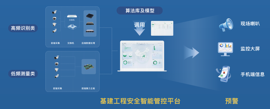 | 构建端-边-云一体化架构,前端部署智能视觉终端、靶标等设备,通过深度学习+机器学习算法实现基坑、支架等结构沉降、位移的亚毫米级精准监测;依托云边协同计算,通过安全穿戴、行为、作业三大核心算法,对人员违规、危险区域入侵、施工流程不规范等行为进行7×24小时高频识别。搭建AI安全监测预警平台,集成五大AI识别库,实现GIS一张图管理、多源数据融合分析、分级预警推送,配套标准化安装调试、WIFI+蜂窝网络通信、合规供电及7×24小时售后运维服务,形成“感知-分析-预警-处置”全流程管控闭环。 | ![]() |